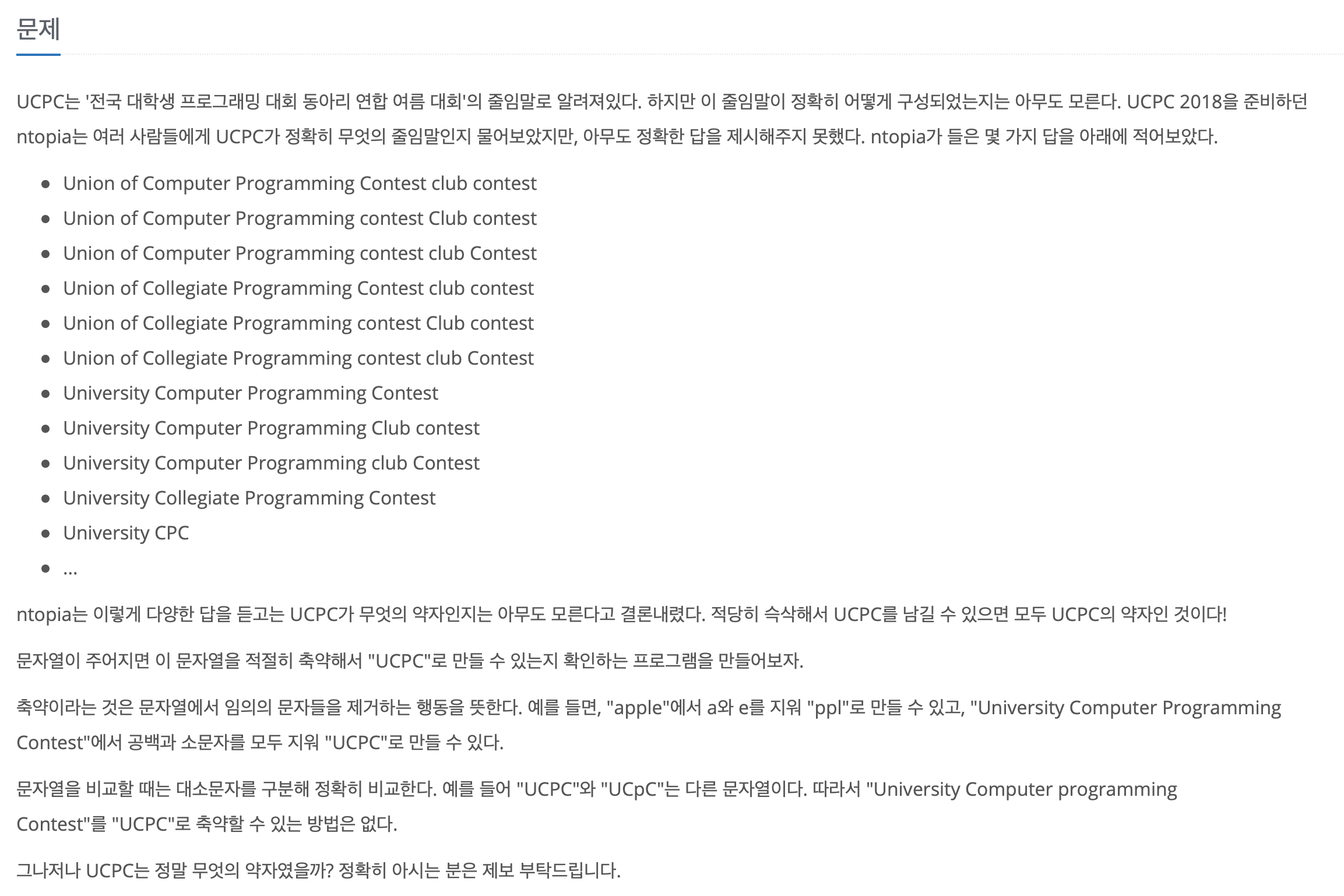 처음 문제를 읽었을 때, 문자열의 대문자만 필터링 한 값이 'UCPC'인지, 아닌지를 구하는 문제로 인식했고