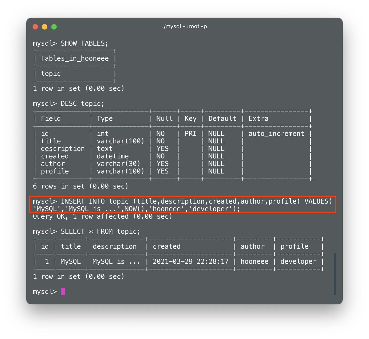 mysql> SELECT * FROM [table_name];