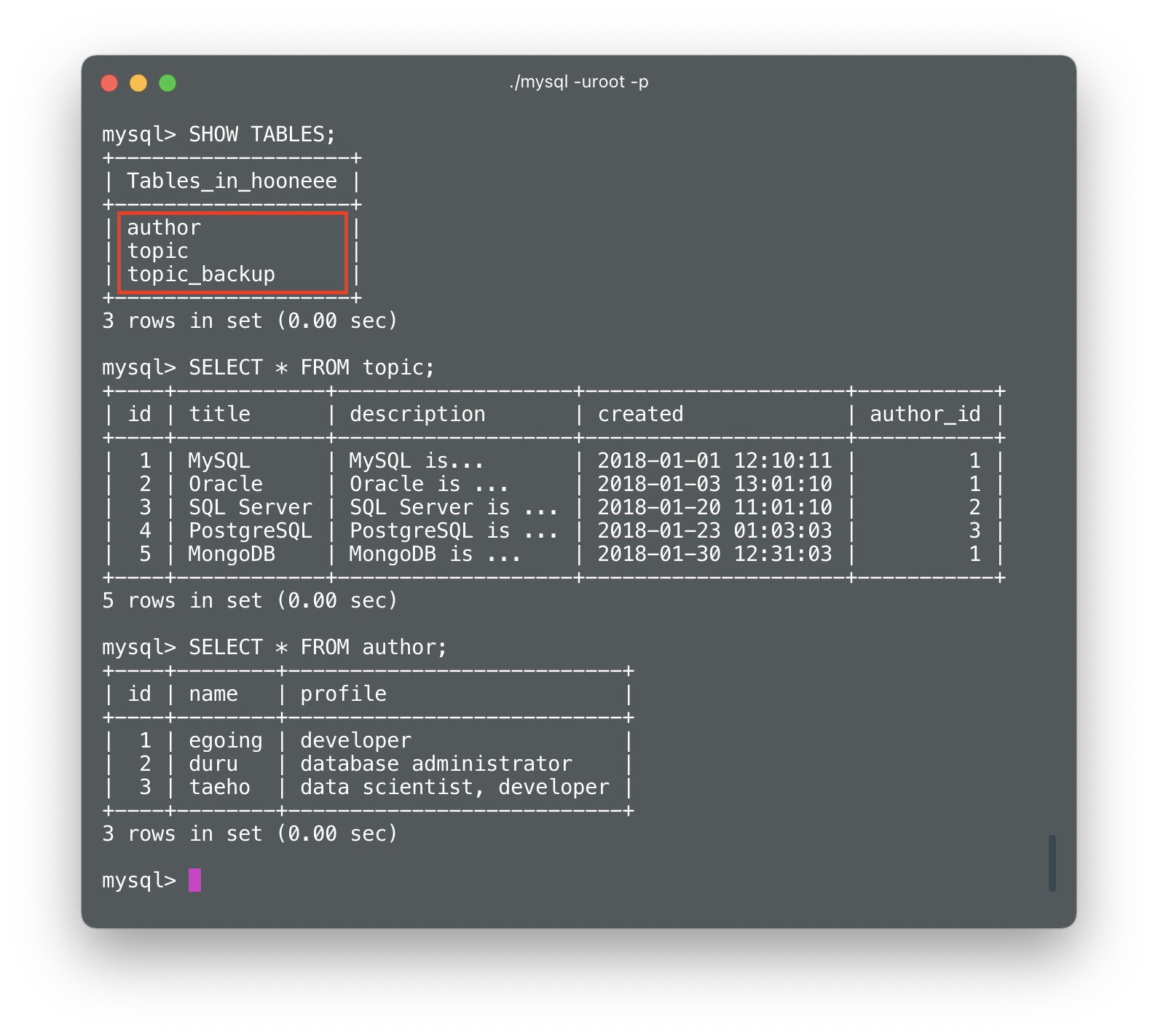 위와 같이 topic 테이블과 author 테이블의 id 값이 결합되어 출력된다. 관계형 데이터베이스의 중요한 기능으로, 가독성을 높여준다.