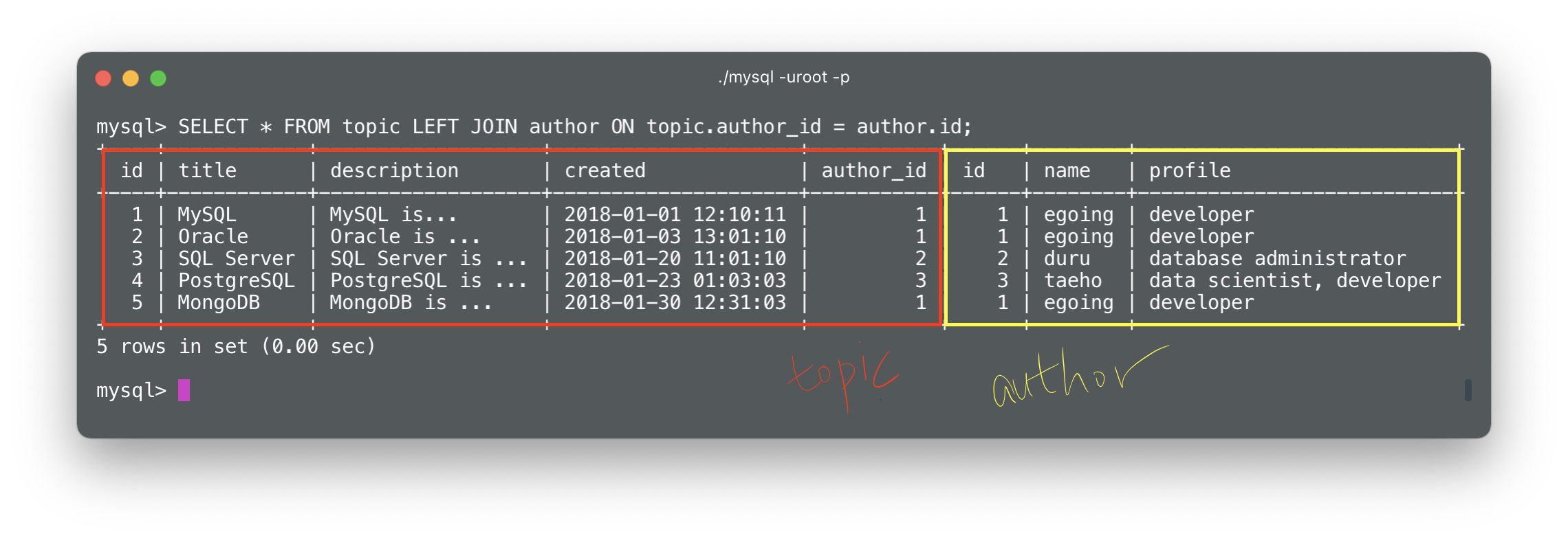 mysql> SELECT * FROM topic LEFT JOIN author ON topic.author_id = author.id;