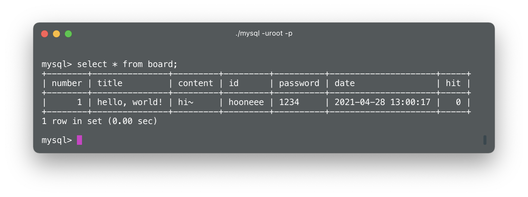 SELECT문으로 board 테이블을 조회해본 결과, 게시글이 정상적으로 DB에 입력된 것을 확인할 수 있다 :)