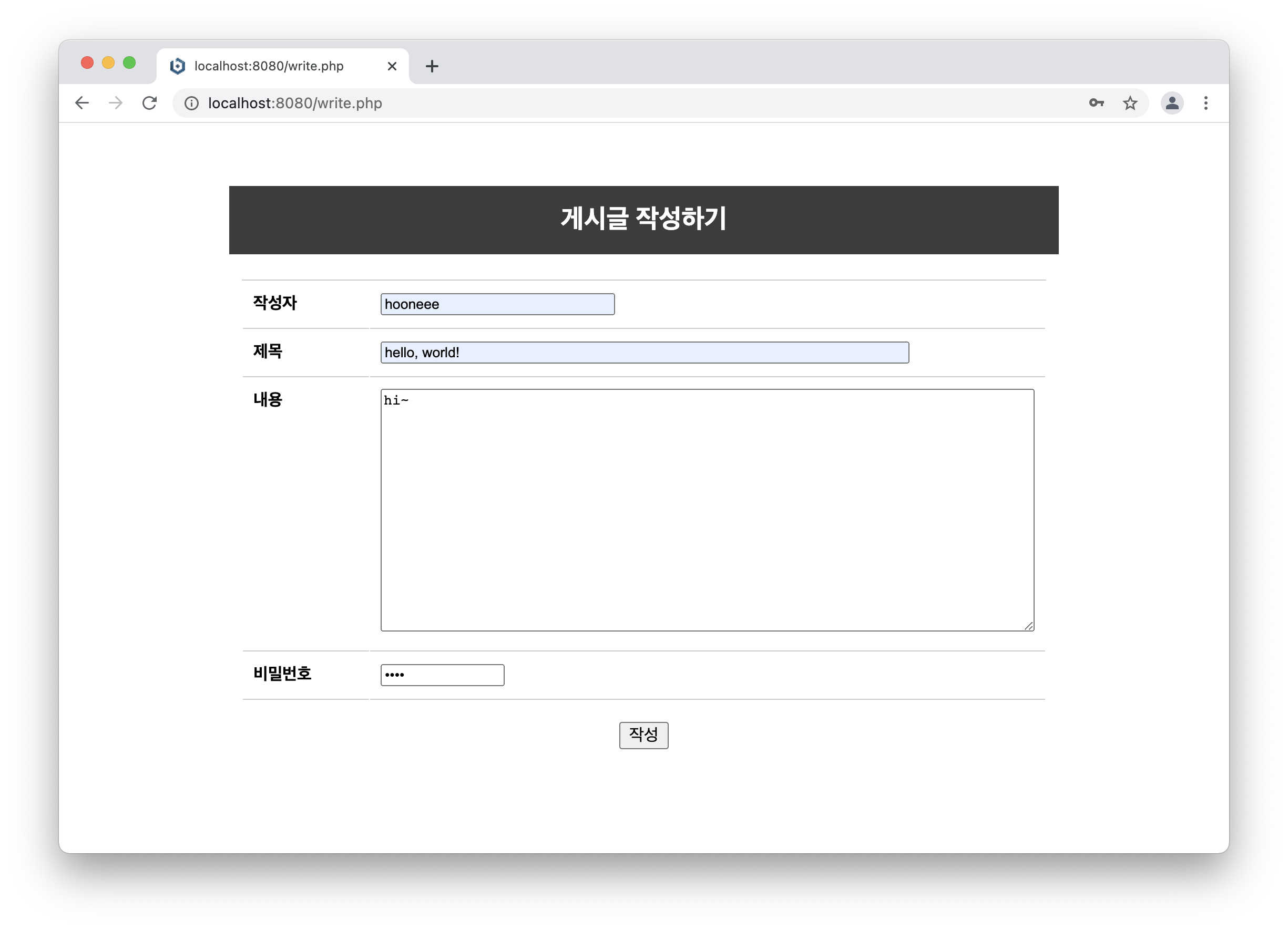write.php는 index.php의 [글쓰기] 버튼을 통해 불러오며, write.php에는 작성자, 제목, 내용, 비밀번호를 입력할 수 있다.