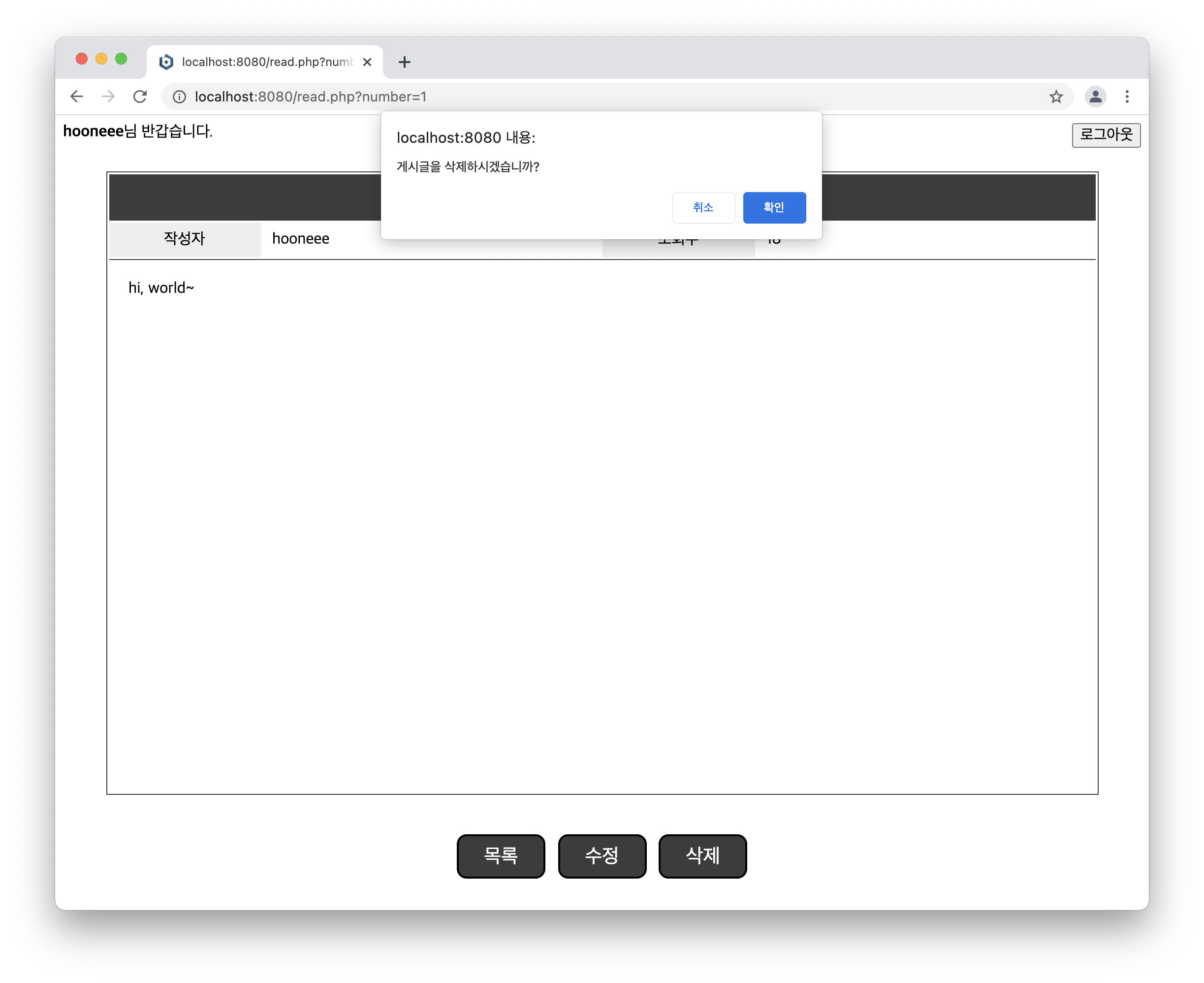 따라서, 사용자로 행동을 한 번 더 검증하기로 했고, read.php 하단의 삭제 버튼에 confirm() 함수를 사용해 소스코드를 개선했다.