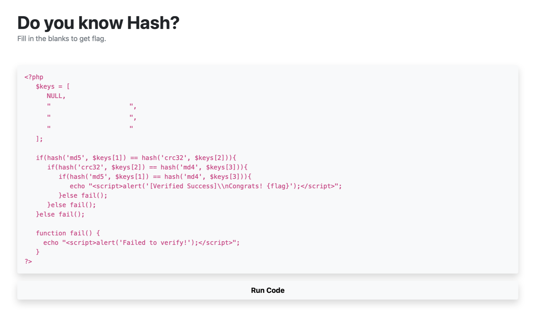 if(hash('crc32', $keys[2]) == hash('md4', $keys[3])){