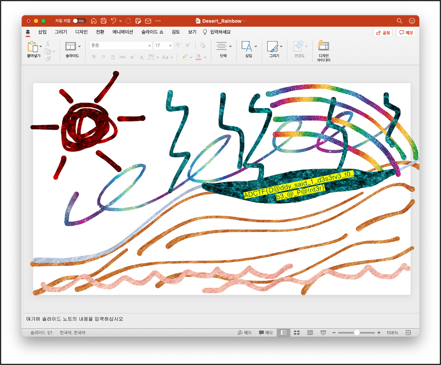 Desert_Rainbow.pptx 파일의 hexdump 값인 DR 내용을 hex editor 등의 툴을 사용하여 pptx 확장자로 저장한다.