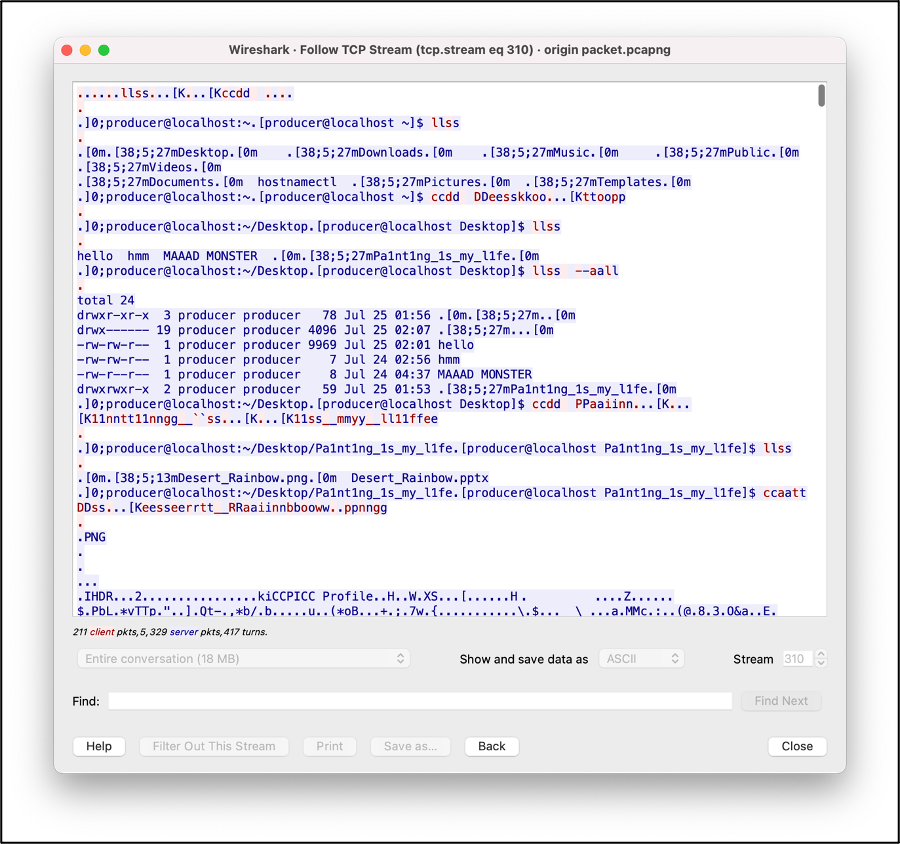 [그림 2]와 같이 관련 패킷을 [Follow] - [TCP Stream]을 통해 살펴보면 TELNET 프로토콜을 사용해 ‘producer@localhost’와 통신한 내역들을 쉽게 볼 수 있으며, 명령어 사용 기록과 함께 출력 결과가 모두 나와있다.