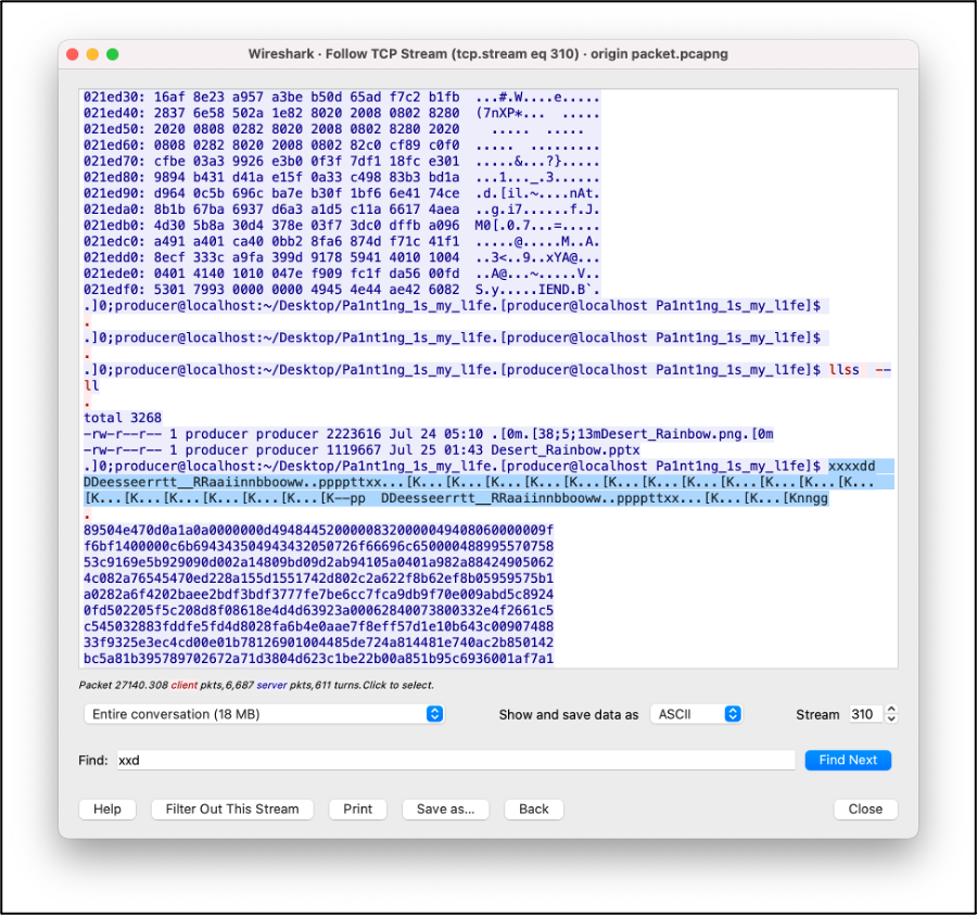 또한, ‘xxd -p Desert_Rainbow.pptx >>> DR’ 명령을 사용한 기록도 볼 수 있는데, ‘-p’ 옵션은 주소나 ASCII 없이 hexdump의 내용만 출력하는 기능이다.