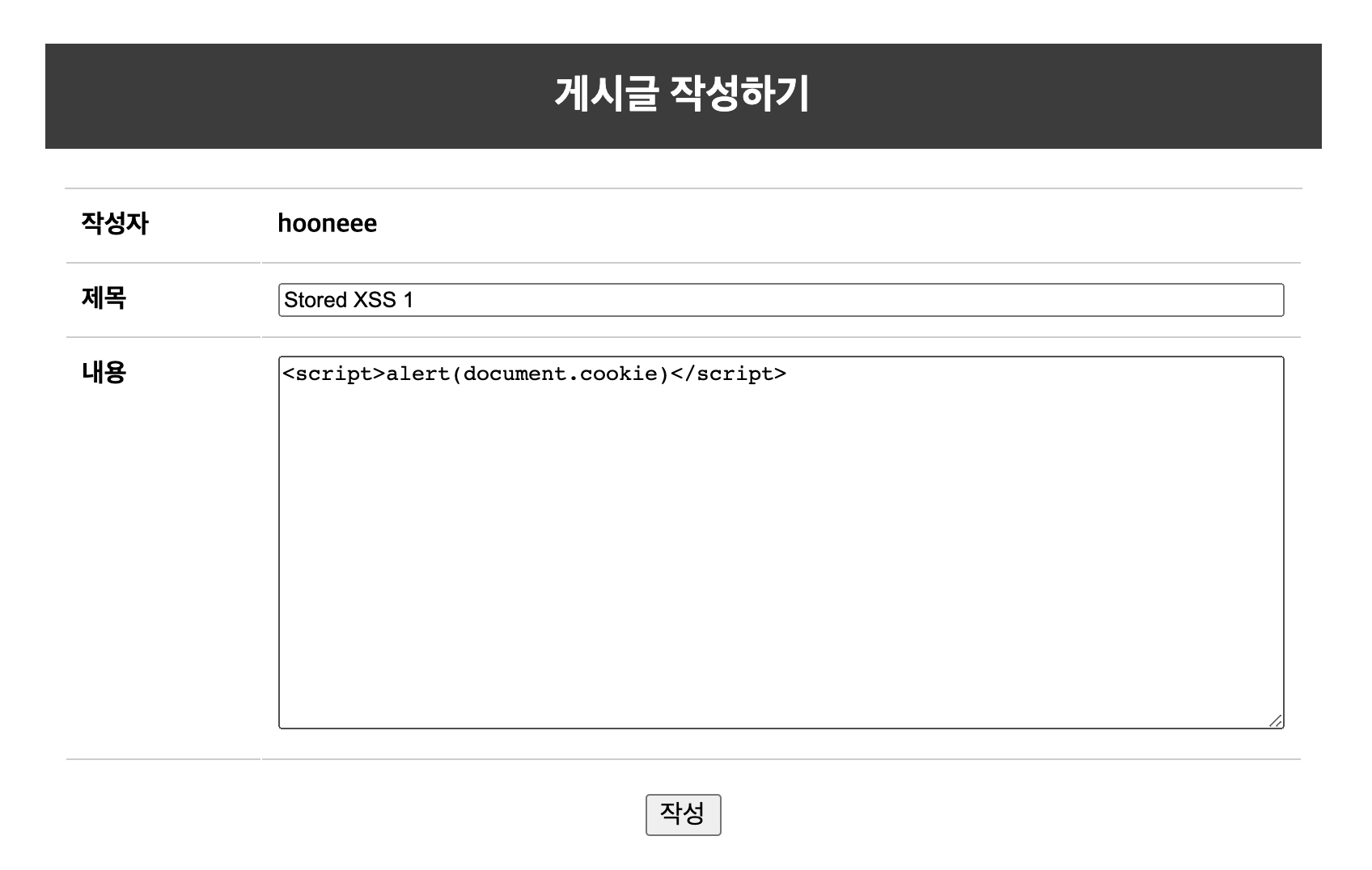 먼저, 가장 간단한 alert 구문에 documet.cookie를 입력하고 저장하여, 게시글 확인 시 민감 정보인 쿠키를 출력하도록 Stored XSS 공격을 진행해 보았다.