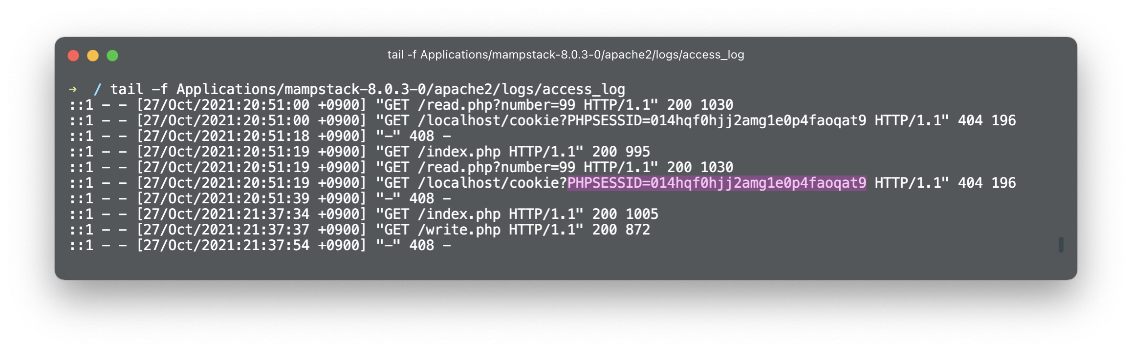 본 게시글에 접근하는 사용자의 쿠키를 확인하기 위해서는 접근 로그를 기록하는 access_log 파일을 확인하면 된다.
