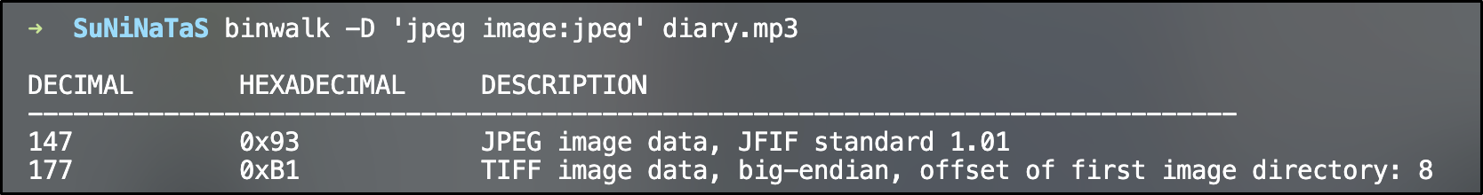 아래쪽에서 jpeg 파일 시그니처를 발견할 수 있고, 이는 diary.mp3 파일 내에 jpeg 이미지 파일이 포함되어 있다는 것을 알 수 있다.