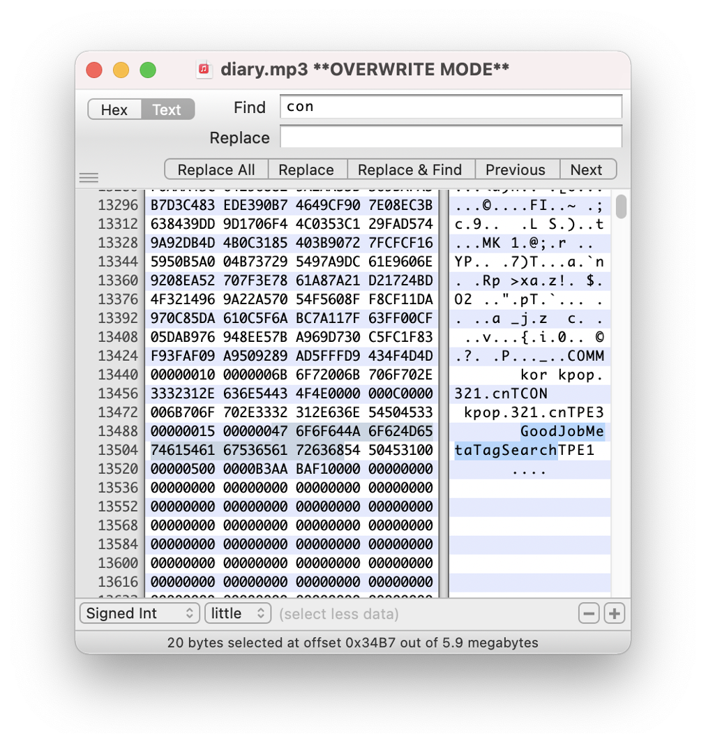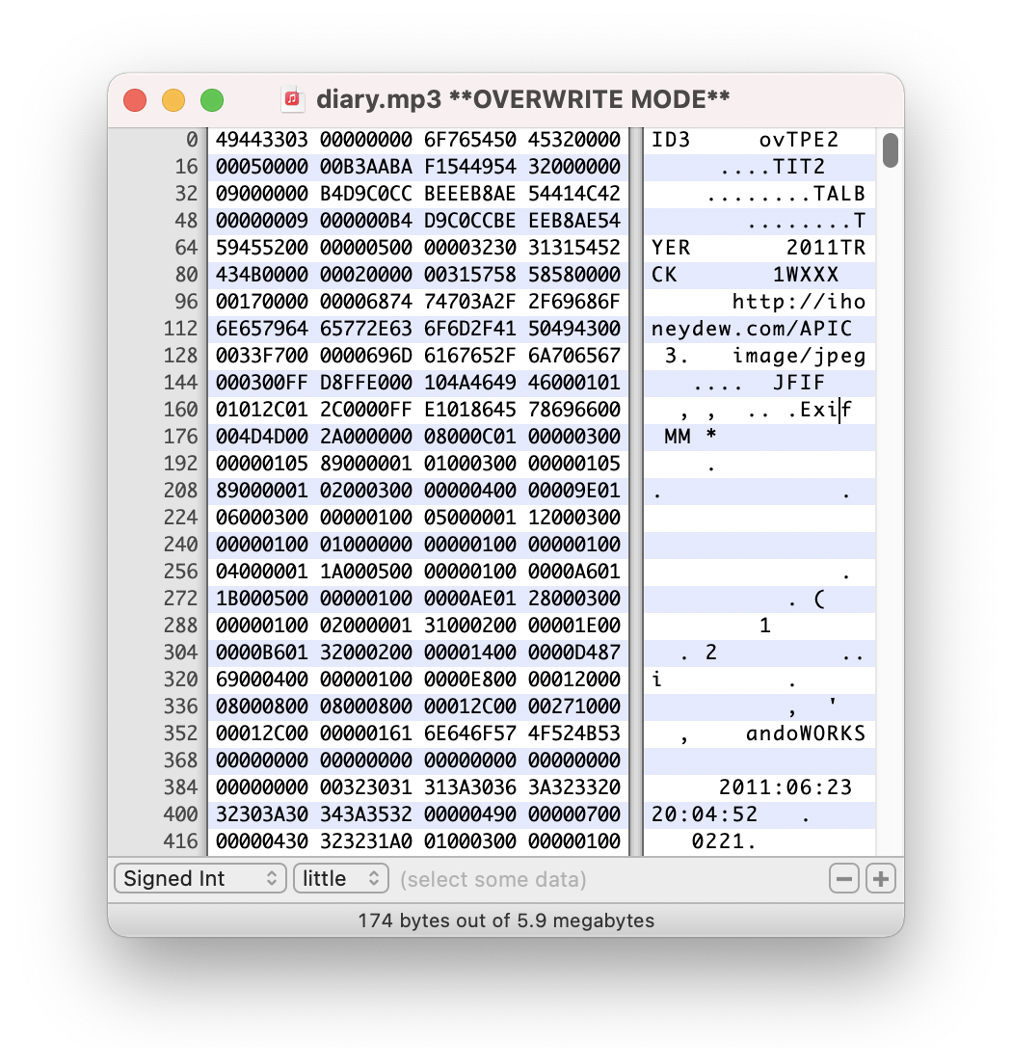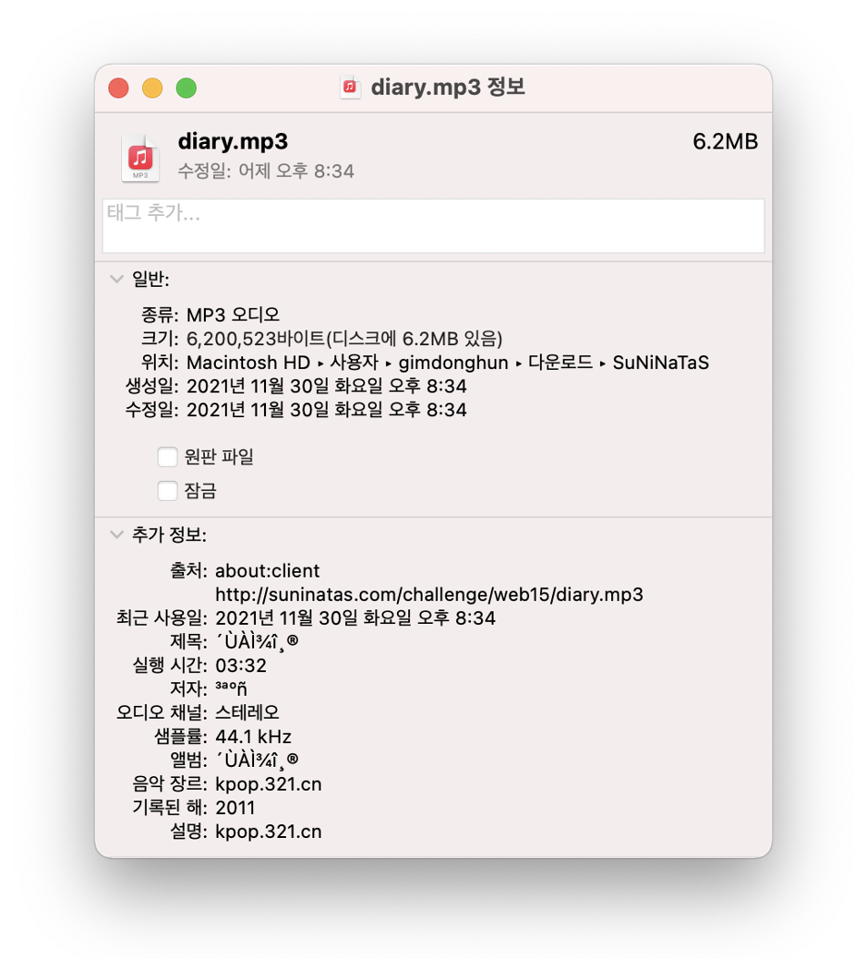 그리하여 다시 diary.mp3의 Hex 값 중 파일의 정보가 저장된 상단 부분을 뒤져봤다.