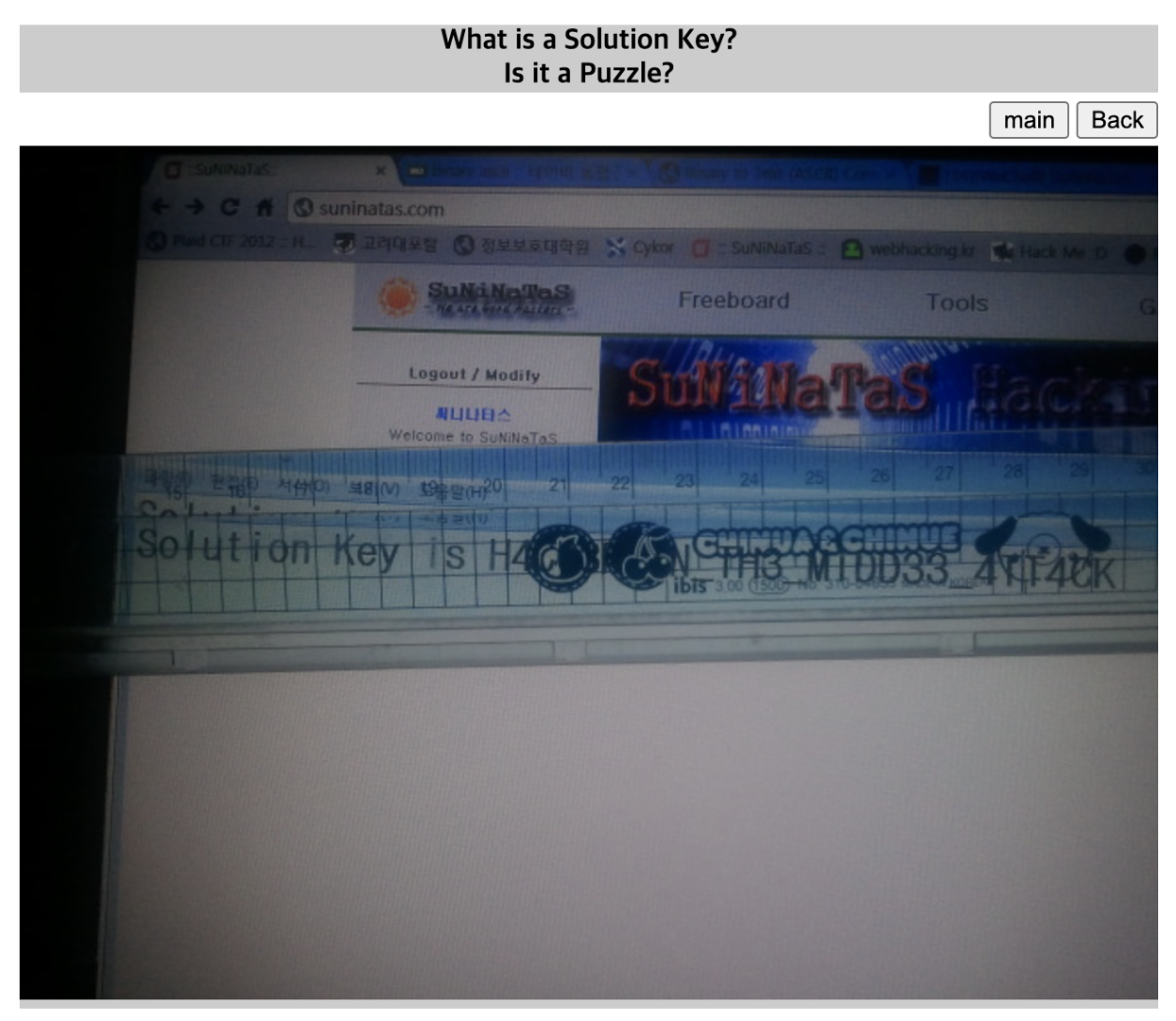 Solution Key를 알아내야 되는 문제이고, 누군가 자로 모니터에 띄워진 Key를 가린 사진 'monitor.jpeg'가 올려져 있다.