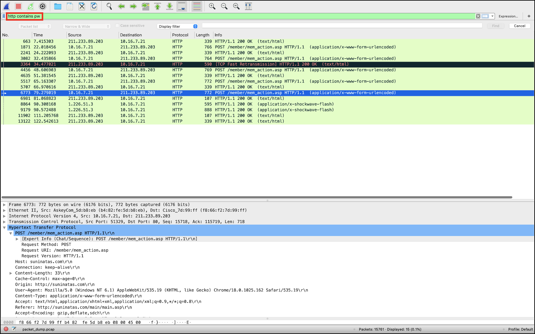 써니나타스의 member password를 찾아야하기에 Wireshark에서 다음과 같이 필터링한다.