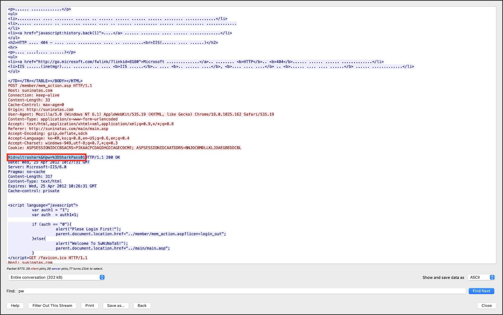 여기서 패킷을 하나 잡고 [Follow] - [HTTP Stream]으로 진입하여, String으로 'pw'을 검색해보자.