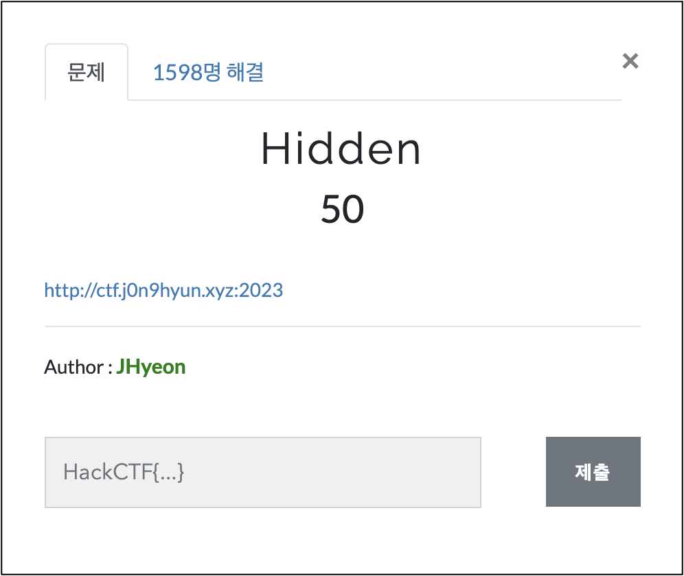 이번엔 Web 분야 HackCTF Hidden(50p) 문제를 풀어봤다.