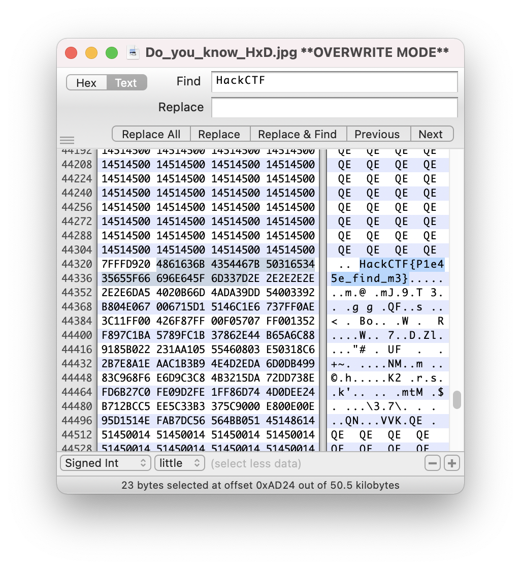 HxD는 Windows용 Hex Editor이라 필자의 Mac에서는 지원되지 않기에 다른 툴을 사용하여 플래그 포맷인 'HackCTF'를 검색했습니다.