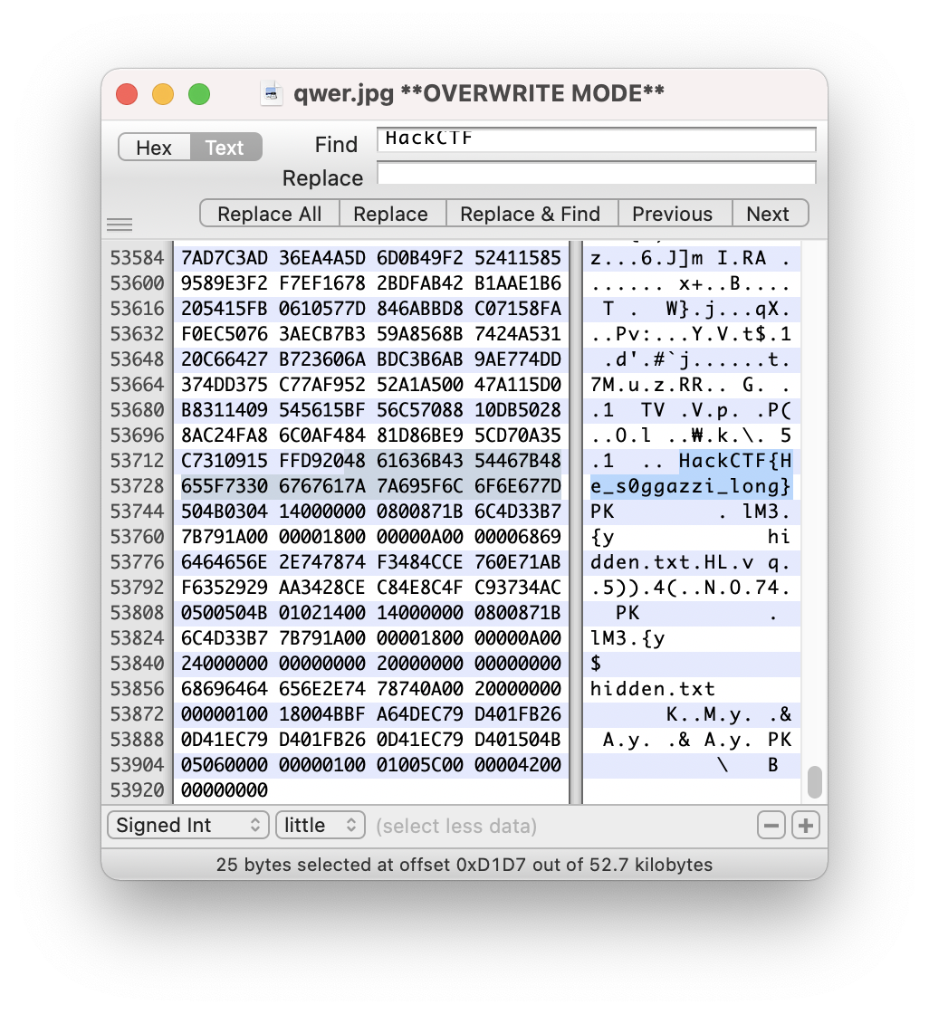 Hex 값 하단부를 보면 압축파일과 hidden.txt 파일이 숨어있는 것을 눈치챌 수 있습니다.