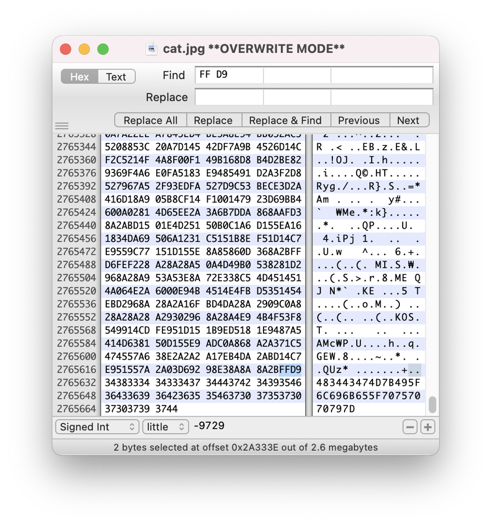 Hex editor로 'cat.jpg'의 hex 값을 뒤져봅시다.