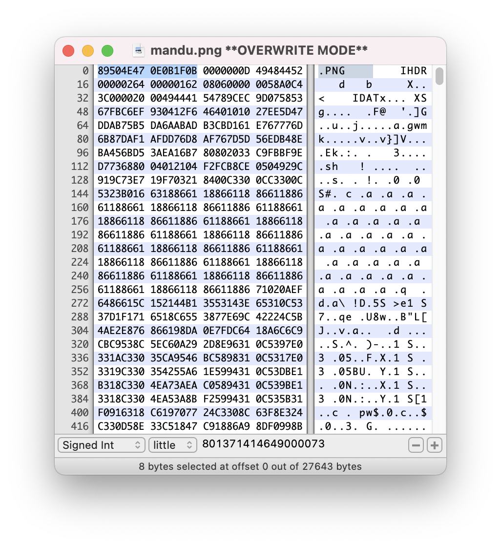 PNG 확장자를 가진 이미지 파일은 헤더 시그니처 값으로 '89 50 4E 47 0D 0A 1A 0A'를 가져야 하는데, 위 그림을 보면 다른 값을 가지고 있다.