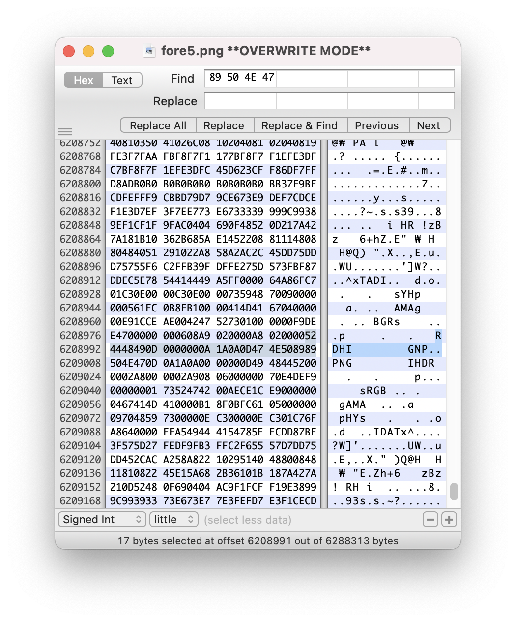 fore5.png 파일을 다운로드하고 hex 값을 뒤져보니 내부에 무수히 많은 PNG 파일이 숨어있었다.