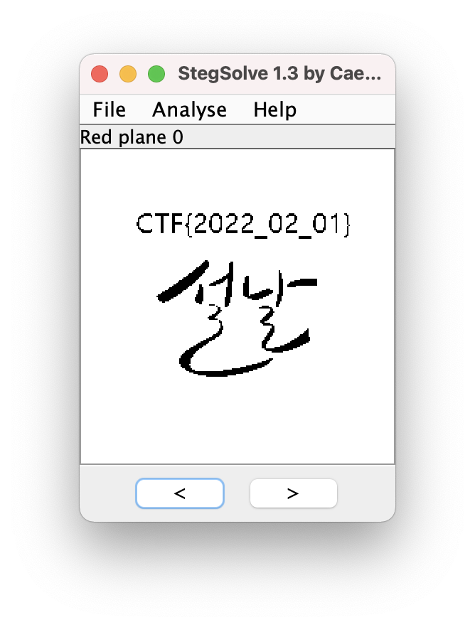스테가노그래피인 것 같아 StegSolve 툴을 돌려보니 아래와 같이 플래그가 나타났다.