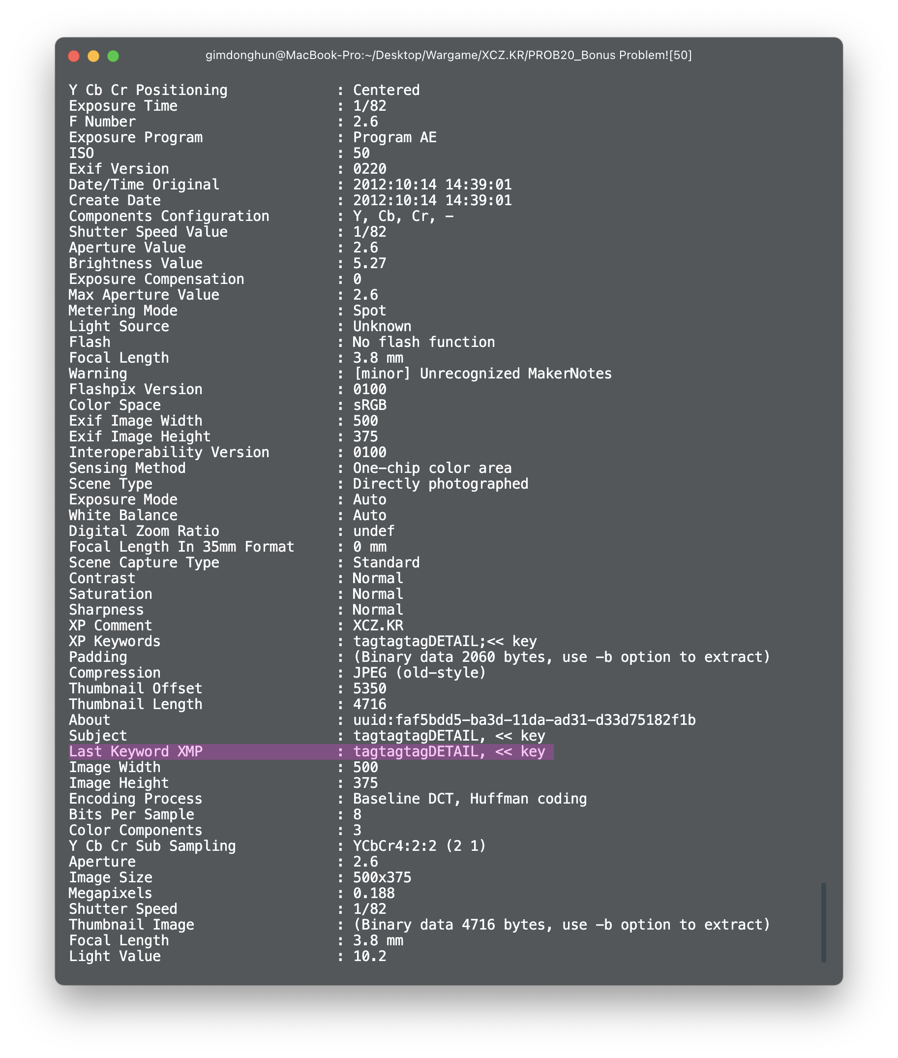 문제의 사진을 다운로드하고 메타데이터를 살피기 위해 exiftool을 사용하였다.