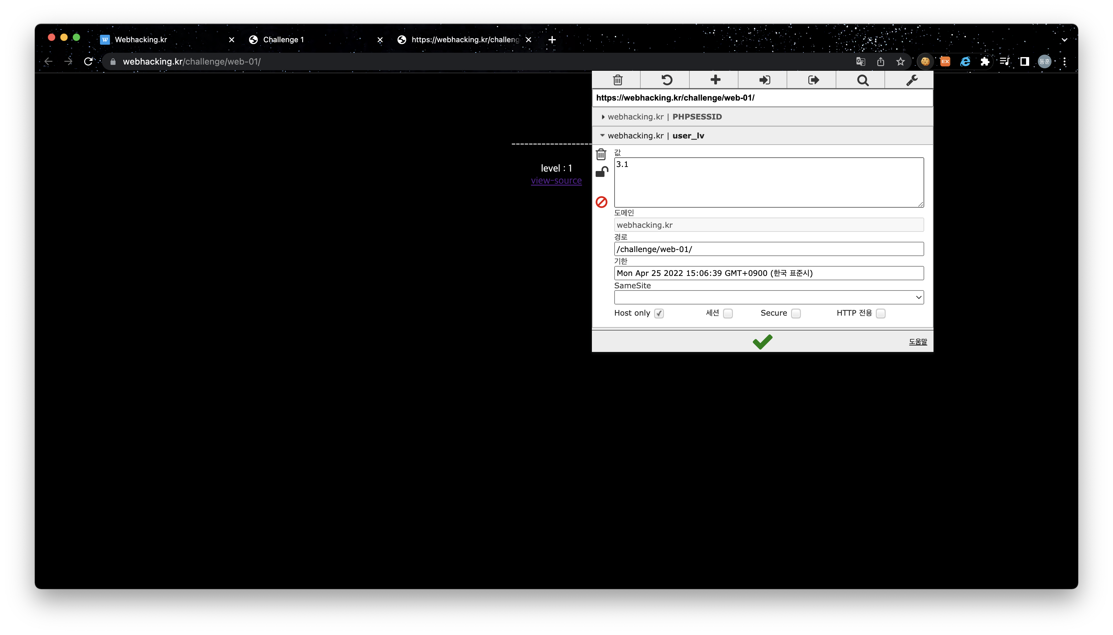 따라서, EditThisCookie 툴을 이용하여 1로 세팅되어 있는 user_lv Cookie 값을 3.1로 설정해주면 된다.